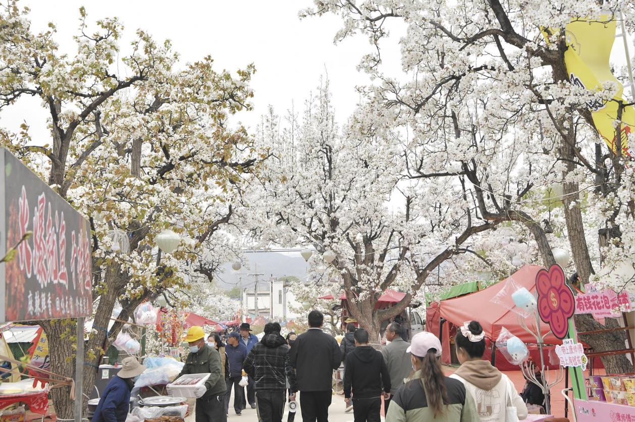 每年“五一”假期前后,這片梨花園秒變熱鬧集會,園子里的村民比游客還高興。幾把新鮮的蔬菜,游客都會爭搶著買;在自家院里支幾張桌椅板凳,炒幾個家常小菜,一天下來能有1000元左右收入。還有的婦女亮出針線絕活,現(xiàn)場織些小玩意售賣,也能掙些零花錢。