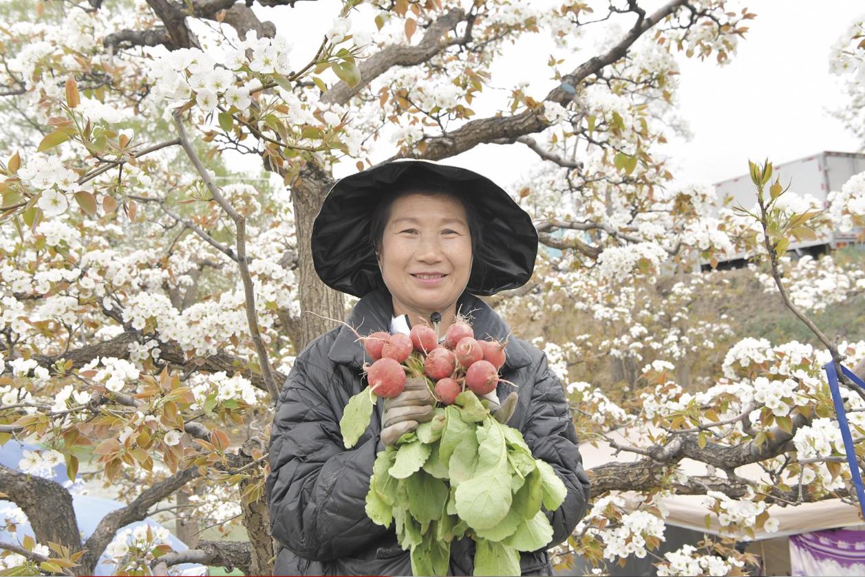 村民王秀英帶著一筐櫻桃蘿卜,挑了一棵花開最盛的梨樹擺攤,一上午就能賣掉大半筐。她熱情洋溢地向游客推介:“這些蘿卜都是早晨剛從地里拔的,還沾著泥土,特別甜,你嘗嘗。”